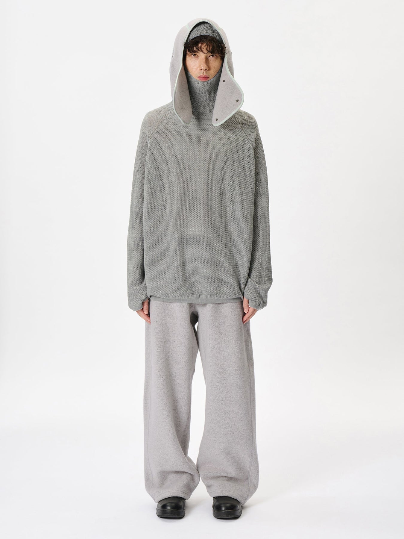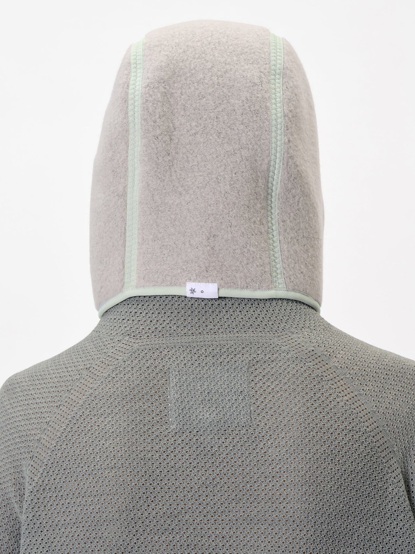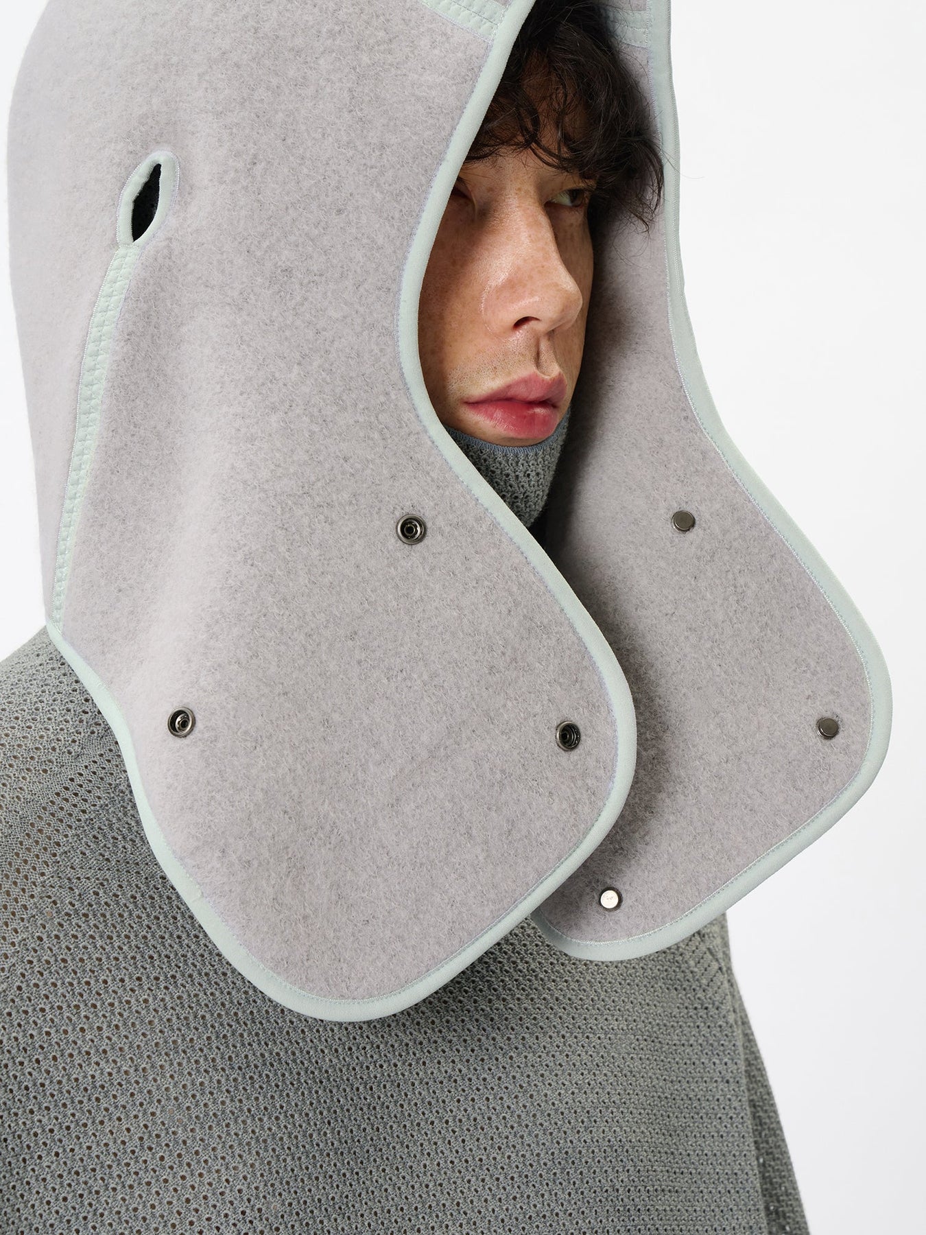 따뜻하고 부드러운 울 플리스 소재로 제작된 후드입니다. 추운 계절에 목부터 머리까지 보호하는 액세서리로 기능하며, 독특한 기모감과 도드라진 절개 라인이 특징입니다.