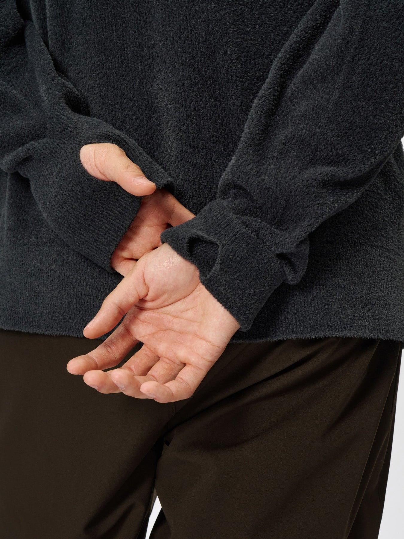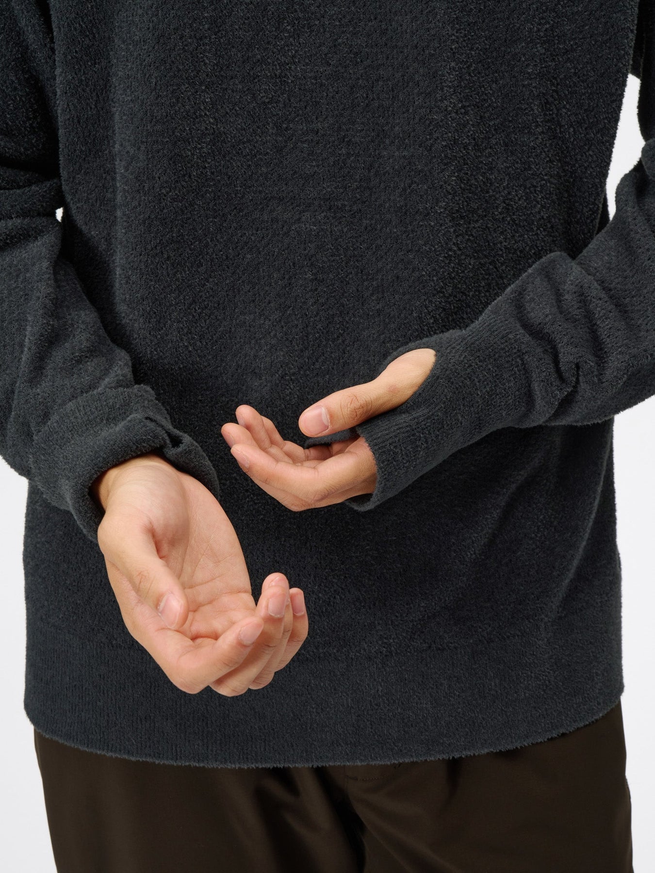 소매는 손등까지 덮는 길이로 길게 디자인된 립 조직 원단을 사용하며 썸홀(Thumbhole) 디테일이 있어 손을 껴서 착용할 수 있습니다. 썸홀을 사용하지 않을 때는 소매를 접어 깔끔하게 연출할 수 있습니다.