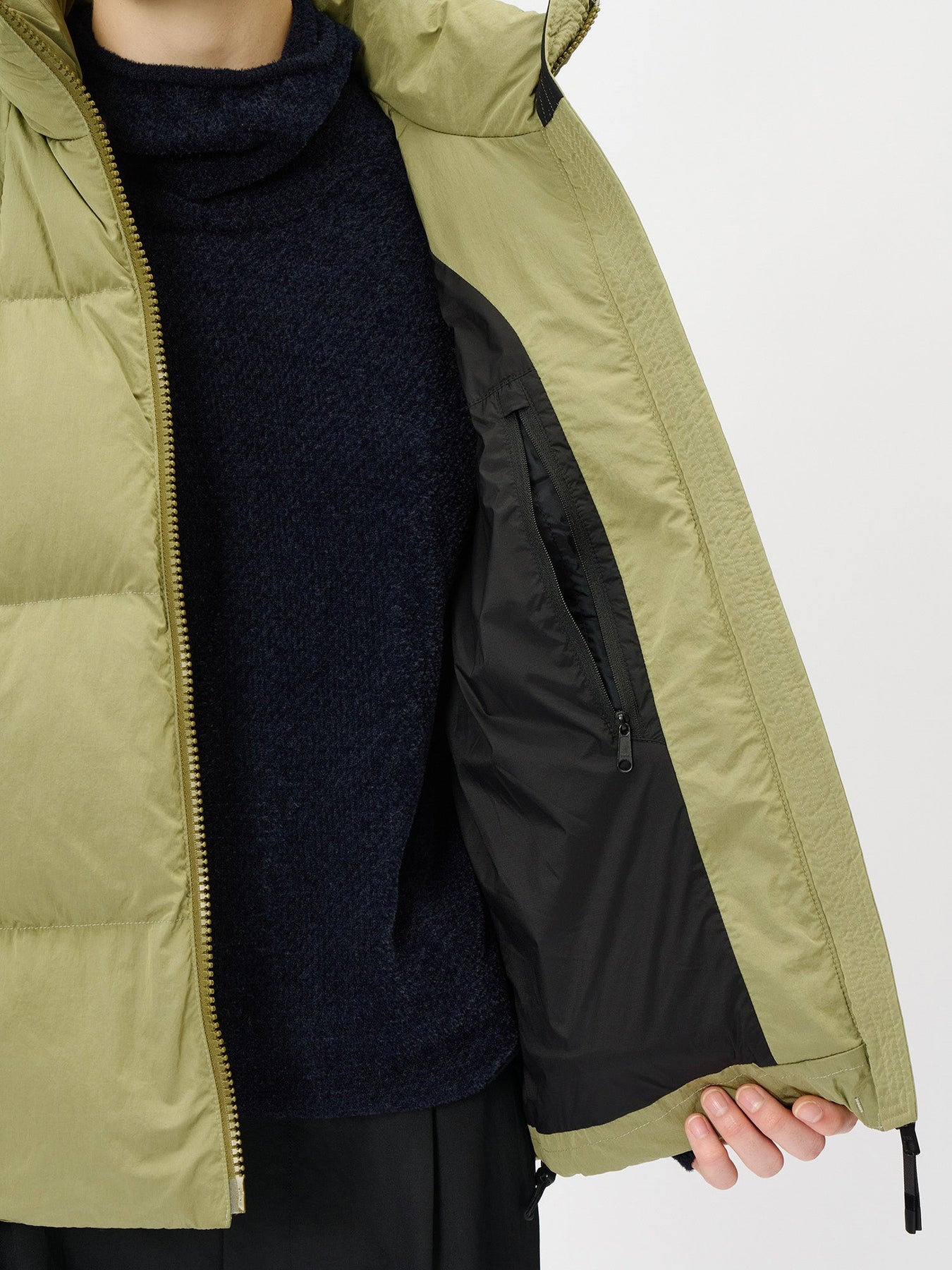 그윽한 음영감이 돋보이는 독특한 텍스처의 나일론 원단으로 완성한 하이로프트 다운 재킷.