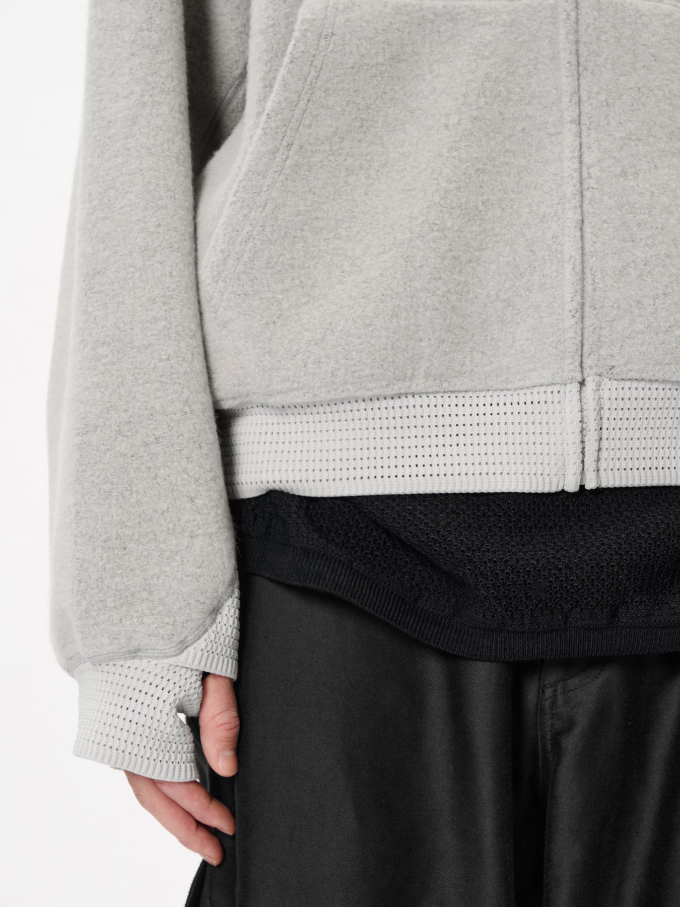 독특한 기모감이 느껴지는 원단과 돋보이는 절개 라인이 특징이며, 소매와 밑단에는 특수한 메쉬 니트 구조의 리브를 적용했습니다.