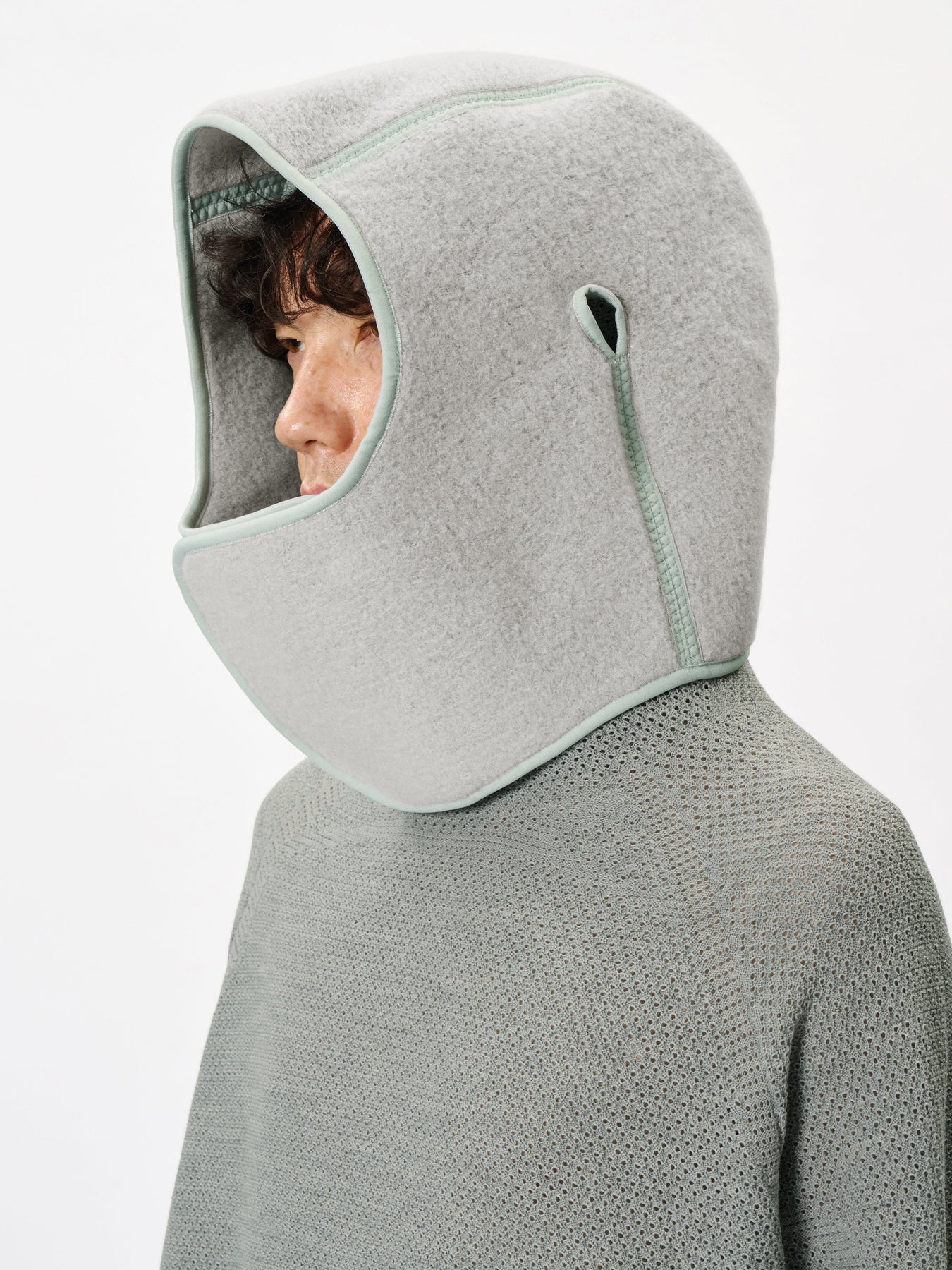 따뜻하고 부드러운 울 플리스 소재로 제작된 후드입니다. 추운 계절에 목부터 머리까지 보호하는 액세서리로 기능하며, 독특한 기모감과 도드라진 절개 라인이 특징입니다.